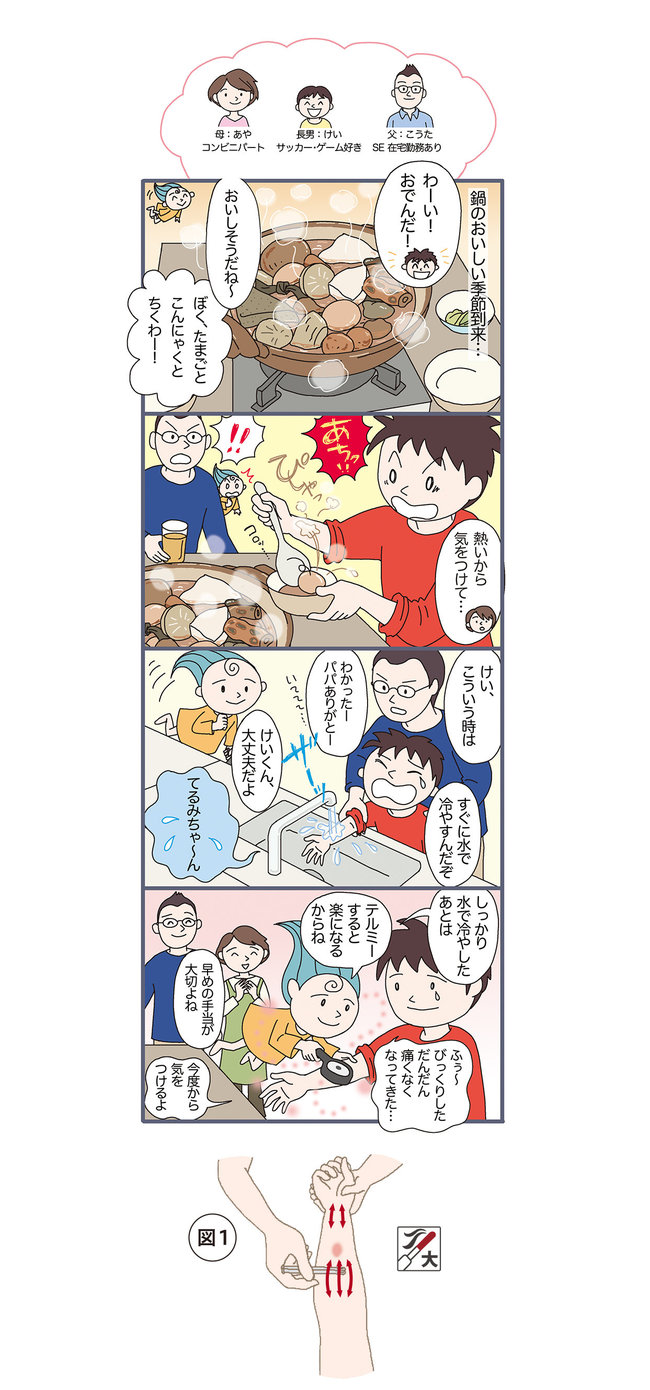 応急処置として、患部に水道水を流し当てながら15分~30分冷却してやけどの広がりを抑え、痛みを和らげることが重要です。深いやけどや広範囲のやけどでは冷やしながら医療機関を受診してください。ここでは家庭で管理できる狭い範囲の軽いやけどについて述べます。