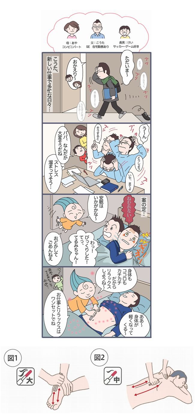 5指2本把握法で柱火は中程度とし、温和で単調な気持ちの良い摩擦をゆっくり繰り返して、眠気(催眠感)を起こさせ、熟睡へと誘いましょう。力加減は弱~中等度で皮膚表面を優しく撫でて温めることで副交感神経は優位になり、心身はリラックスします。また、皮膚表面が温まると身体の末梢(手足)の血行が良くなり放熱されやすく、深部体温の低下に繋がり、脳は睡眠モードになります。うつ伏せの足から上行性(体幹の方)に行うと筋肉が和らぎリラックスできます(図1)。睡眠は疲れた心身を回復させ、体調を整えるためにはとても大切です。